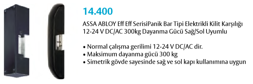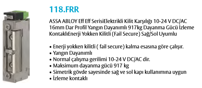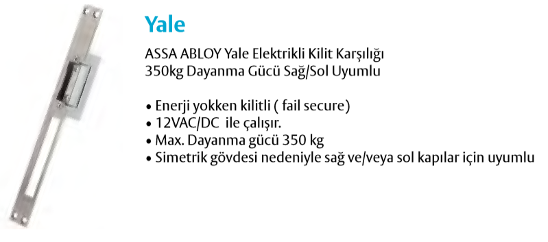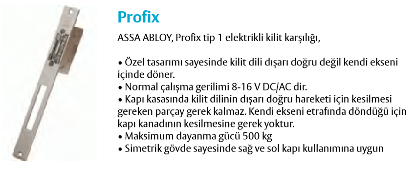 Elektrikli kilit karşılıkları kontrolü geçiş istenilen kapılarda kullanılan aksesuarlardan bir tanesidir. Kullanım amacına göre enerji yokken kilitli (fail secure) veya enerji varken kilitli (fail safe) olmak üzere iki tiptir. Elektrikli kilit karşılıkları ahşap, aluminyum veya saç kapılara uygulanabilir.