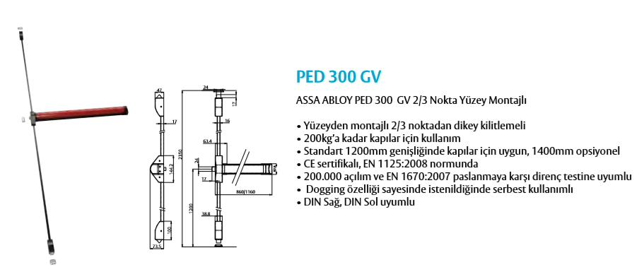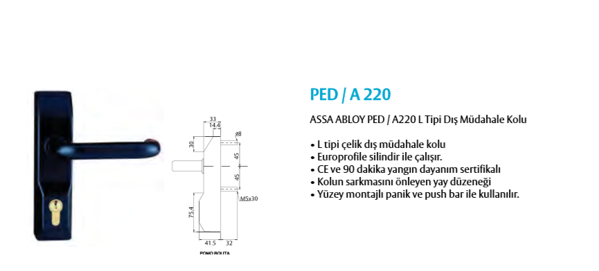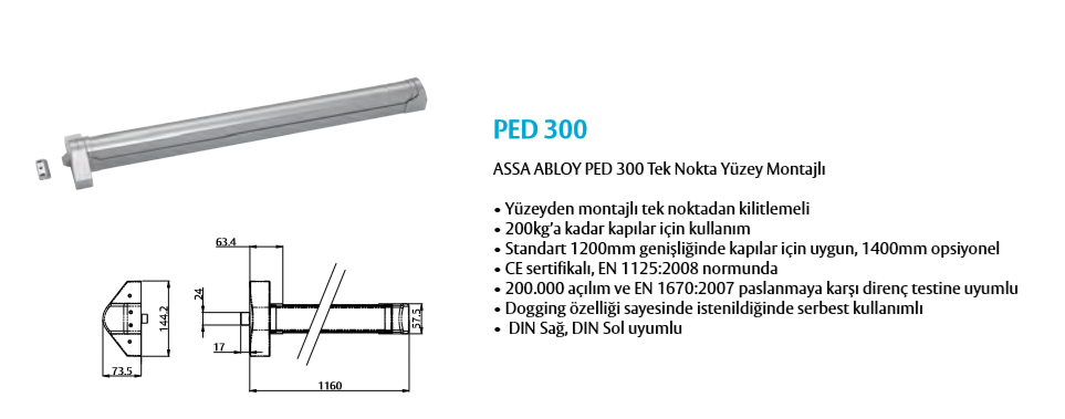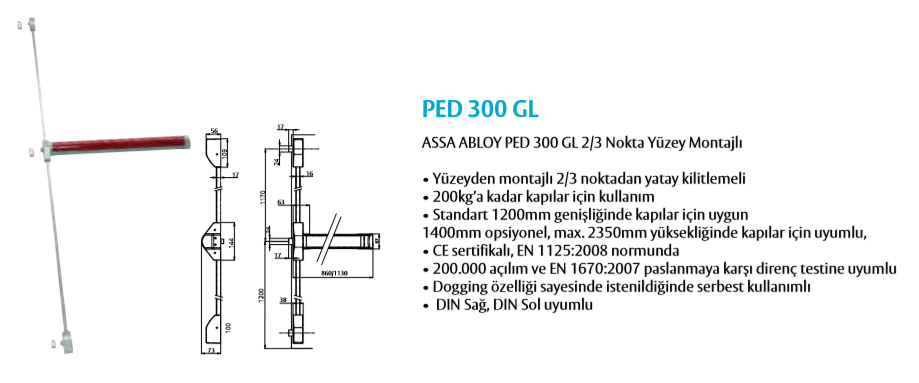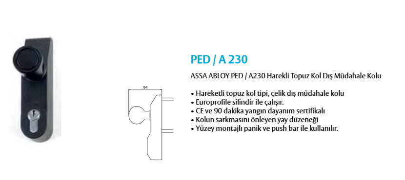 ASSA ABLOY’un panik çıkış aksesuarları, çıkış kapılarını mümkün olan tüm yangın ve güvenlik standartlarına ve yönetmeliklerine göre emniyet altına alır. ASSA ABLOY panik çıkış aksesuarları, tüm ihtiyaçları, konforu ve dizayn bütünlüğünü karşılamak için panik ve push bar olarak farklı modellerde tasarlanmıştır.